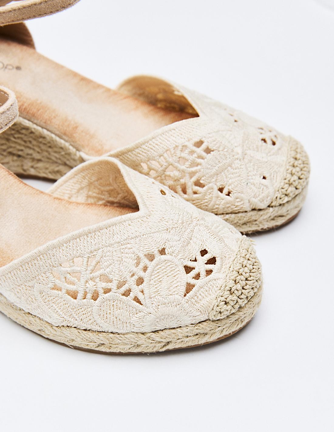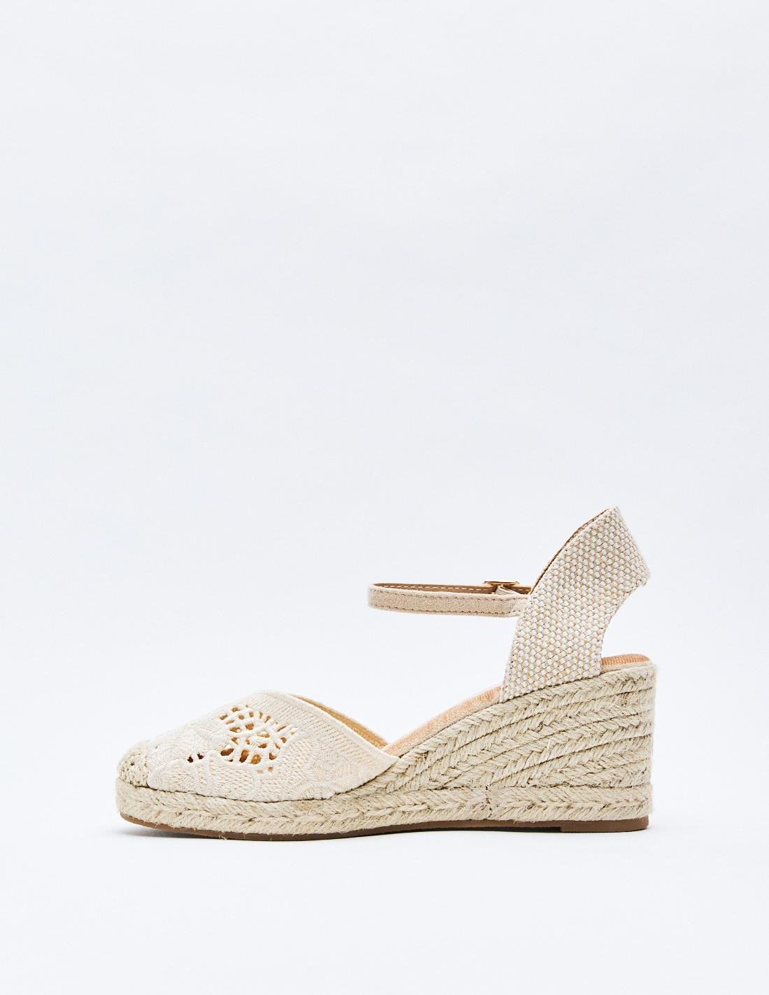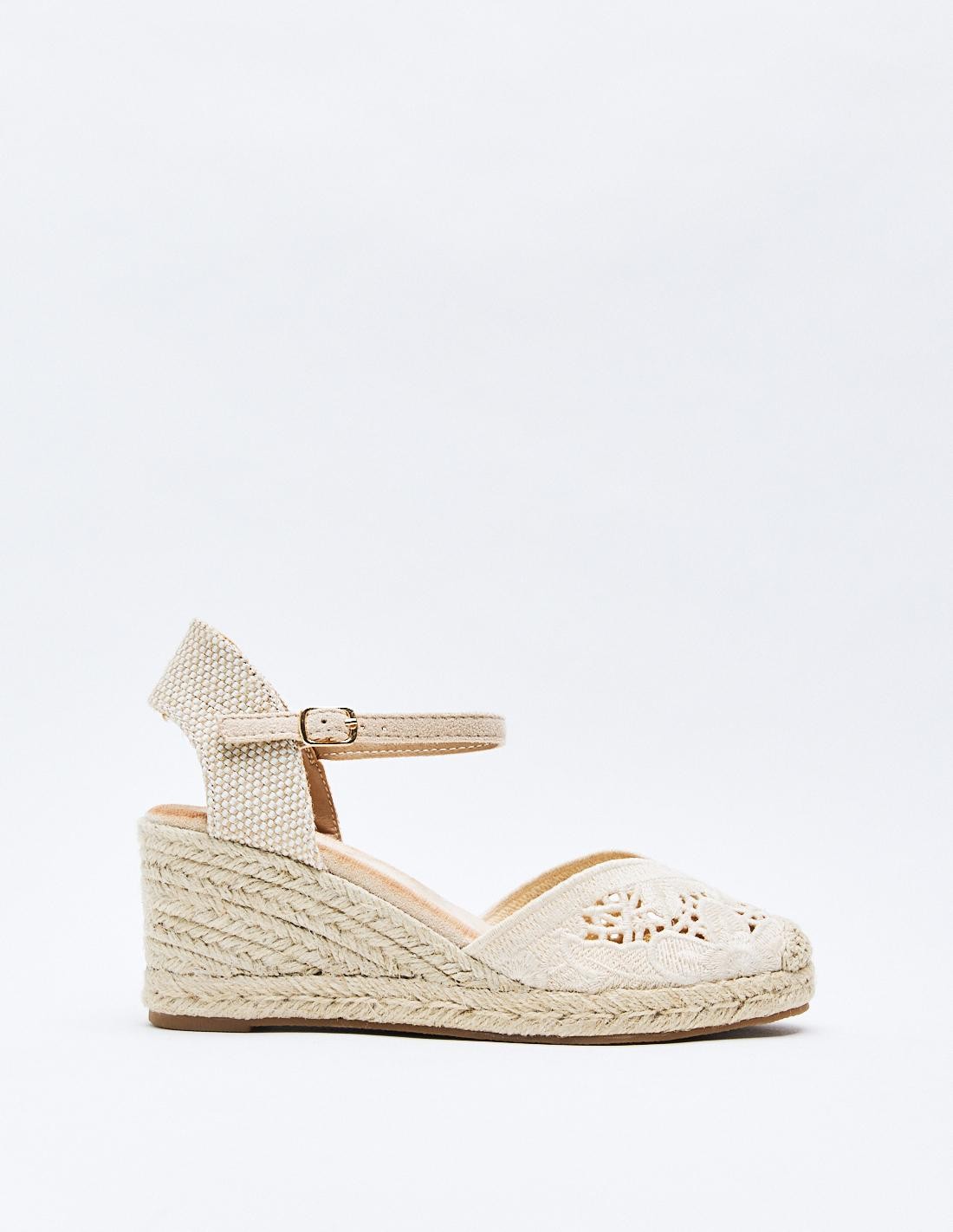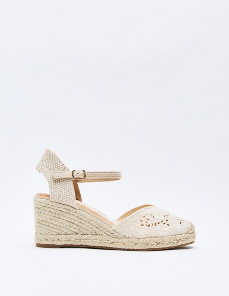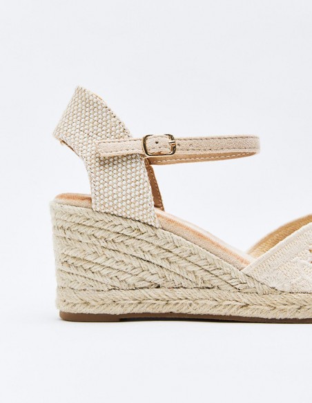 Zapato destalonado tipo alpargata en efecto tela con diseño floral . Tacón alto en forma de cuña. Cierre mediante pulsera con hebilla en el tobillo. Suela de goma con yute . Altura del tacón: 8 cm