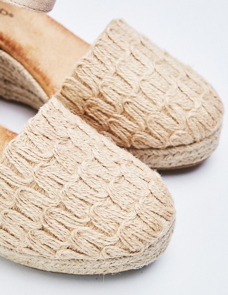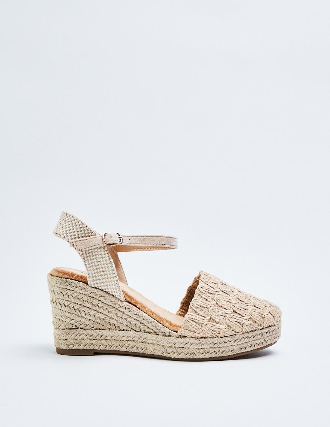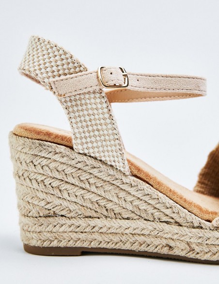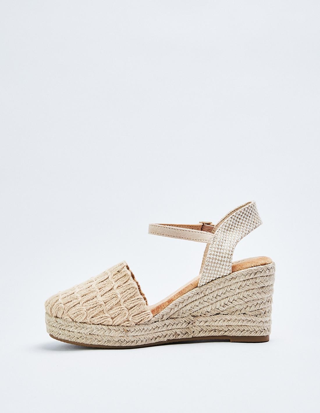 Sandalia con tacón tipo cuña de yute. Cierre mediante puelsera en el tobillo.