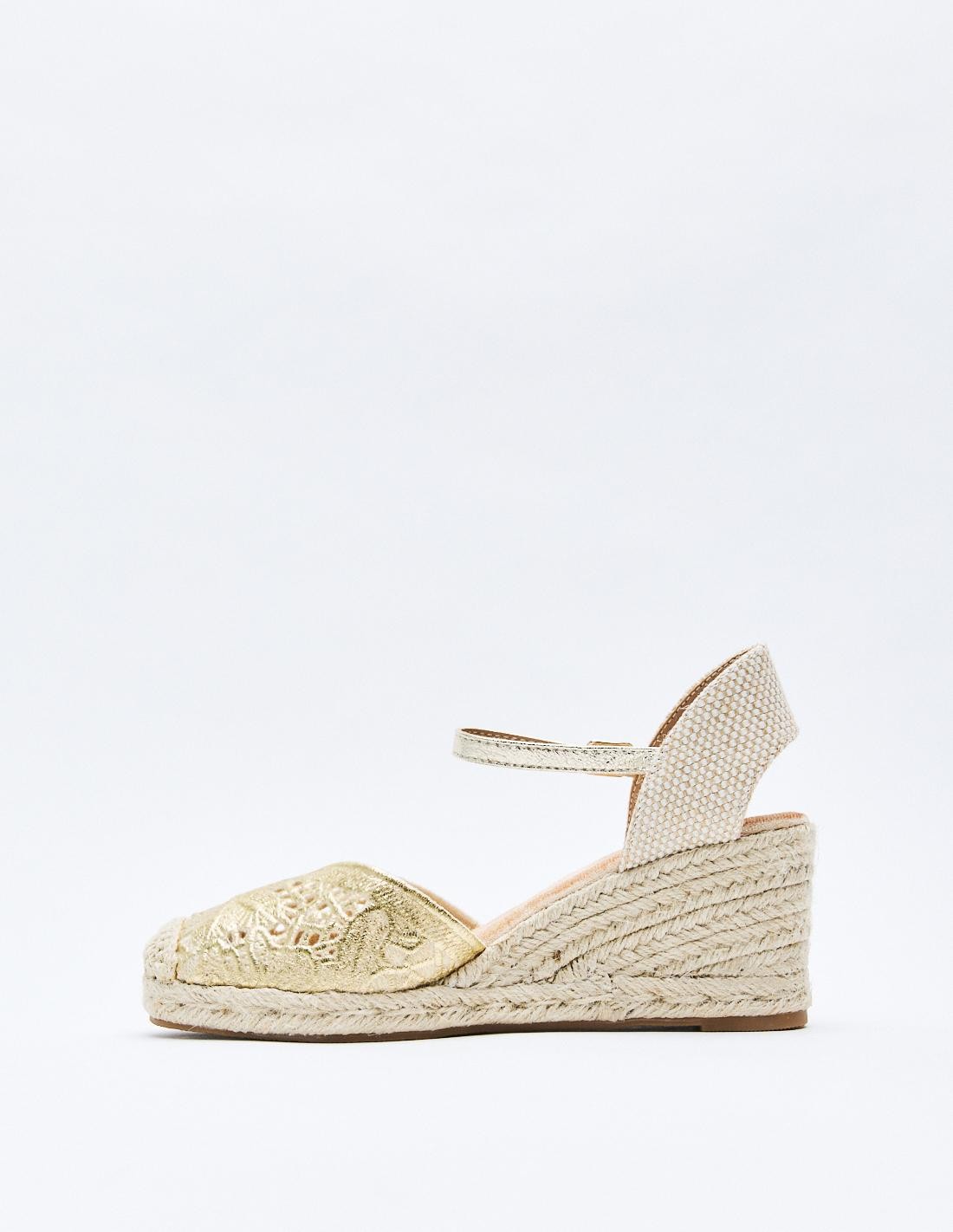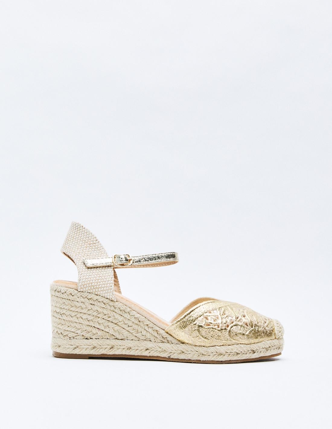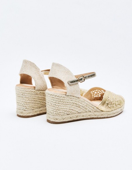 Zapato destalonado tipo alpargata en efecto metalizado con diseño floral . Tacón alto en forma de cuña. Cierre mediante pulsera con hebilla en el tobillo. Suela de goma con yute .