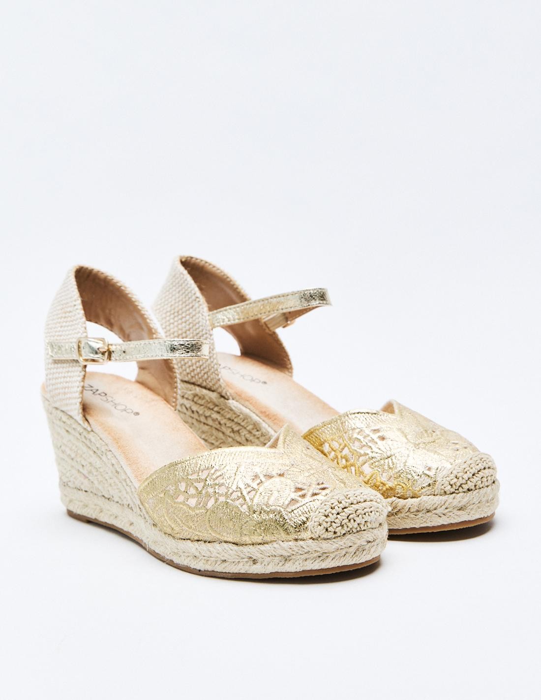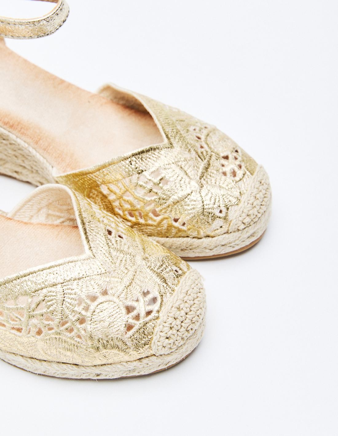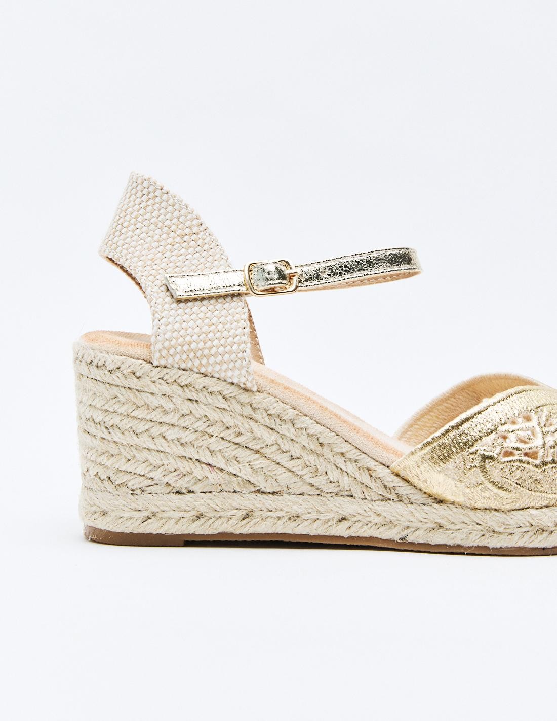 Zapato destalonado tipo alpargata en efecto metalizado con diseño floral . Tacón alto en forma de cuña. Cierre mediante pulsera con hebilla en el tobillo. Suela de goma con yute .