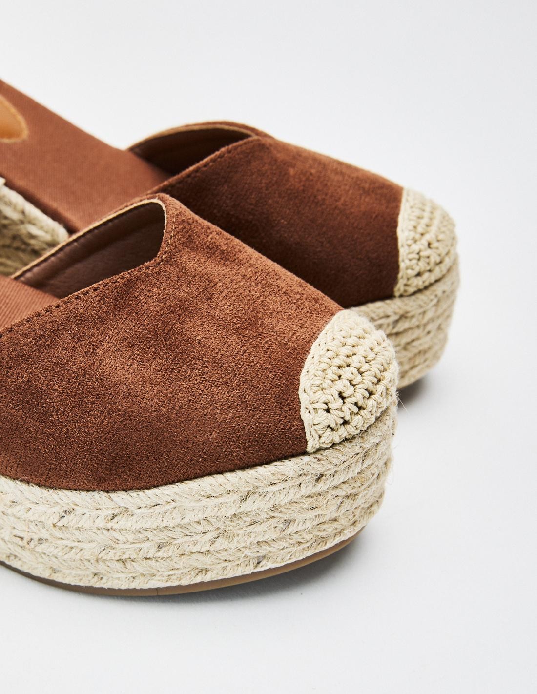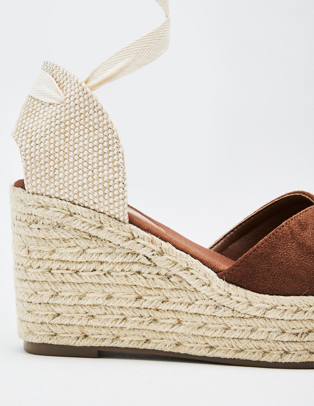 Zapato tipo alpargata estilo cu;a en efecto serraje . Suela forrada de yute. Cierre mediante cinta a lo largo de la pierna . Altura tacón : 12 CM