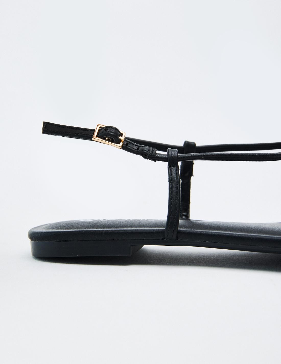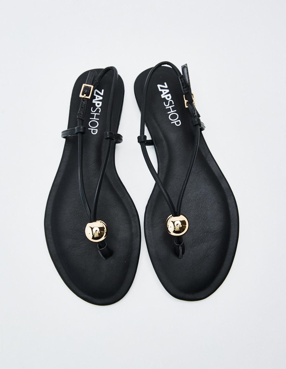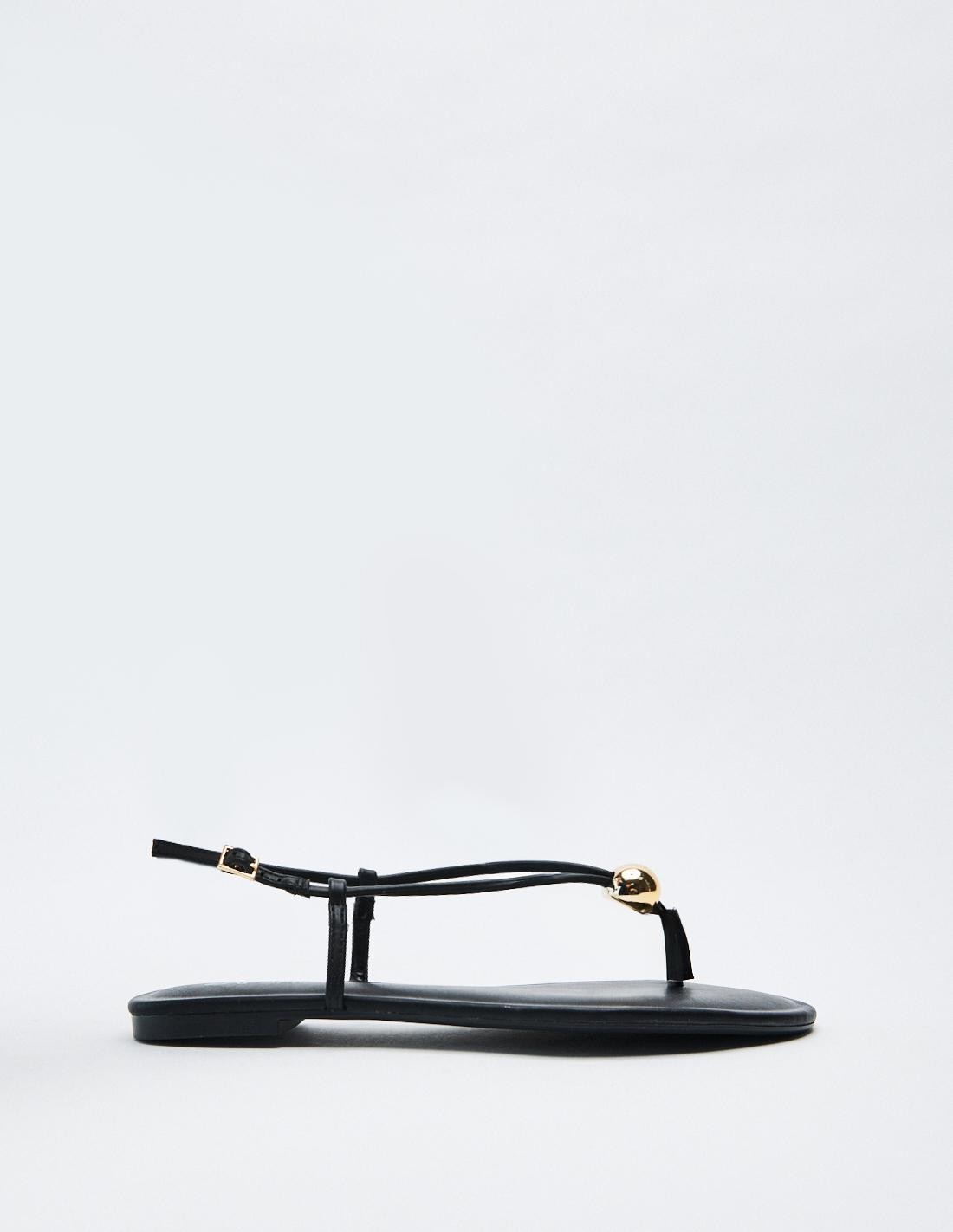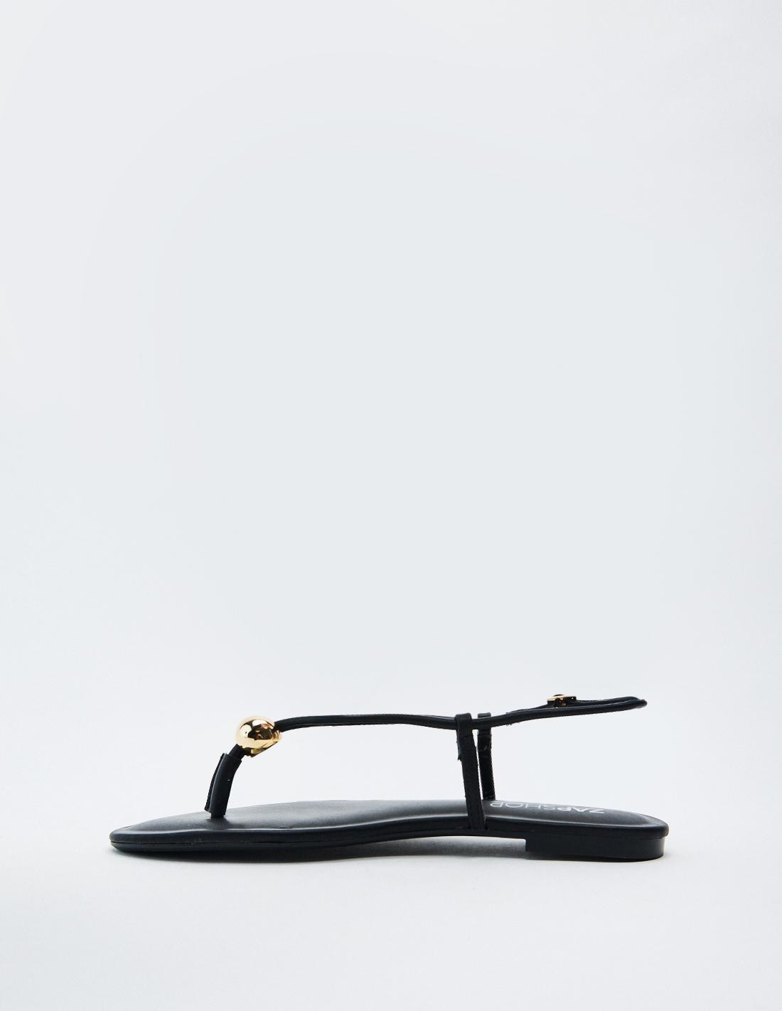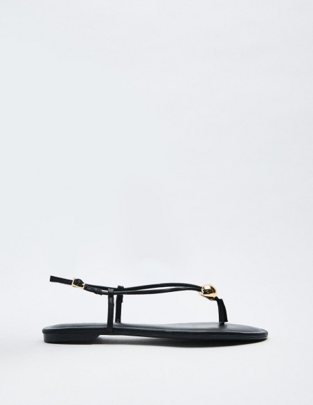 Zapato tipo sandalia plana en efecto piel en la parte delantera con posición para el dedo. Detalle de pieza metálica con forma de circulo en el dedo. Cierre mediante tira con hebilla a la pulsera del tobillo. Acabado en punta redonda. Altura de la suela: 1 cm