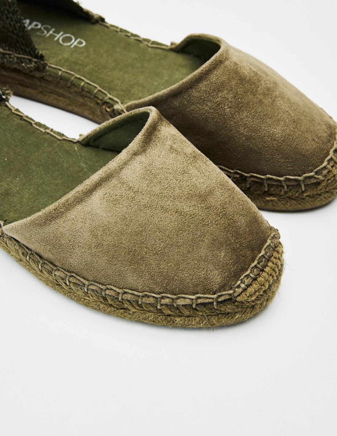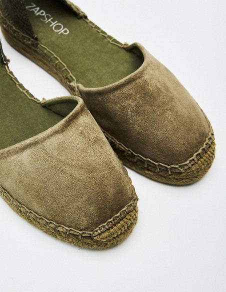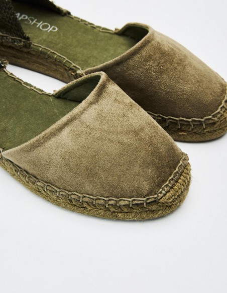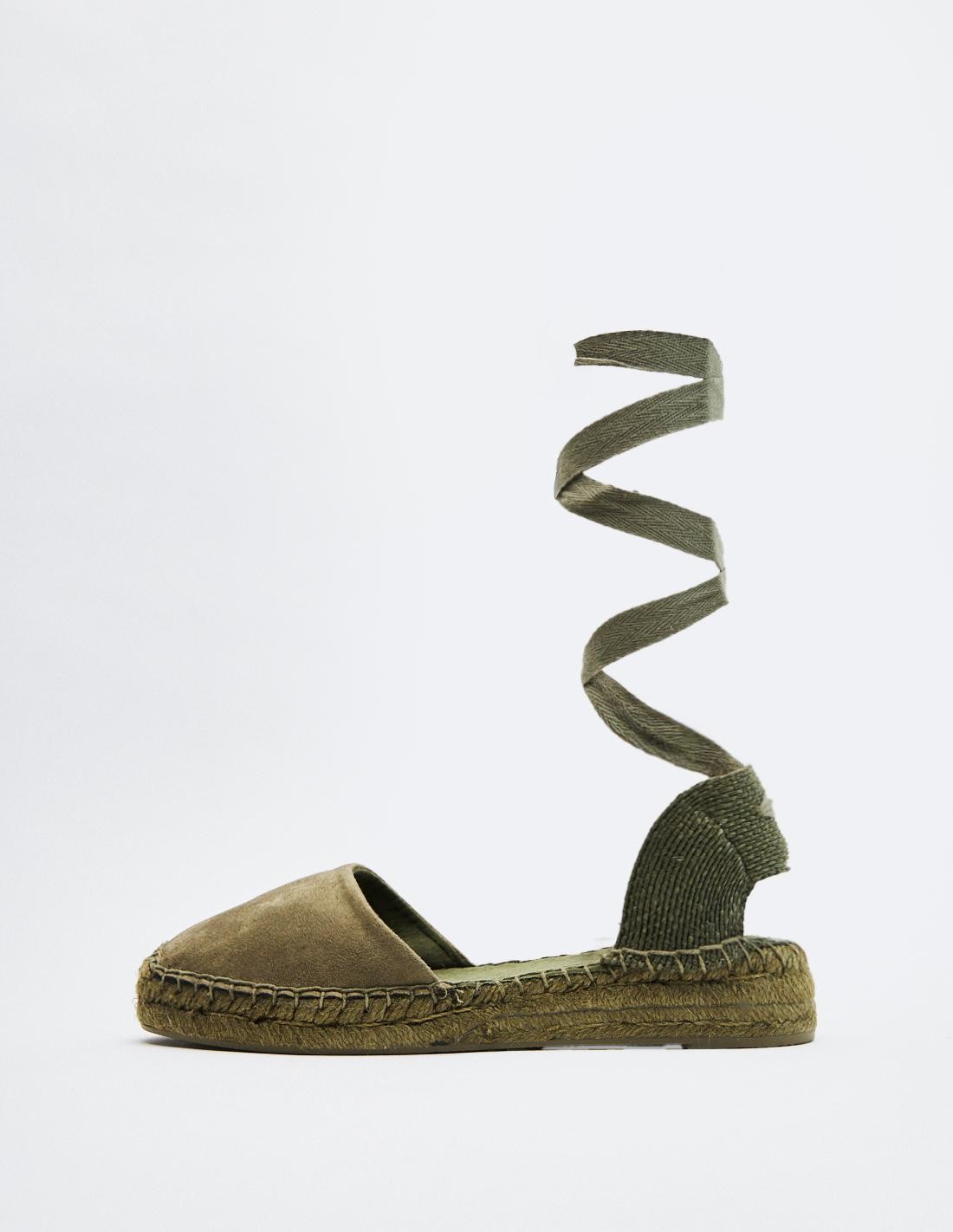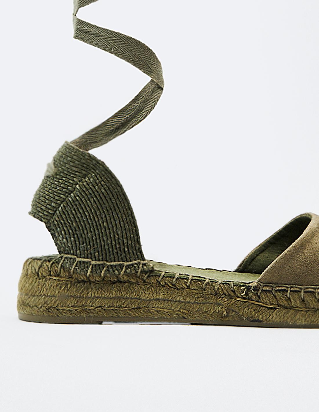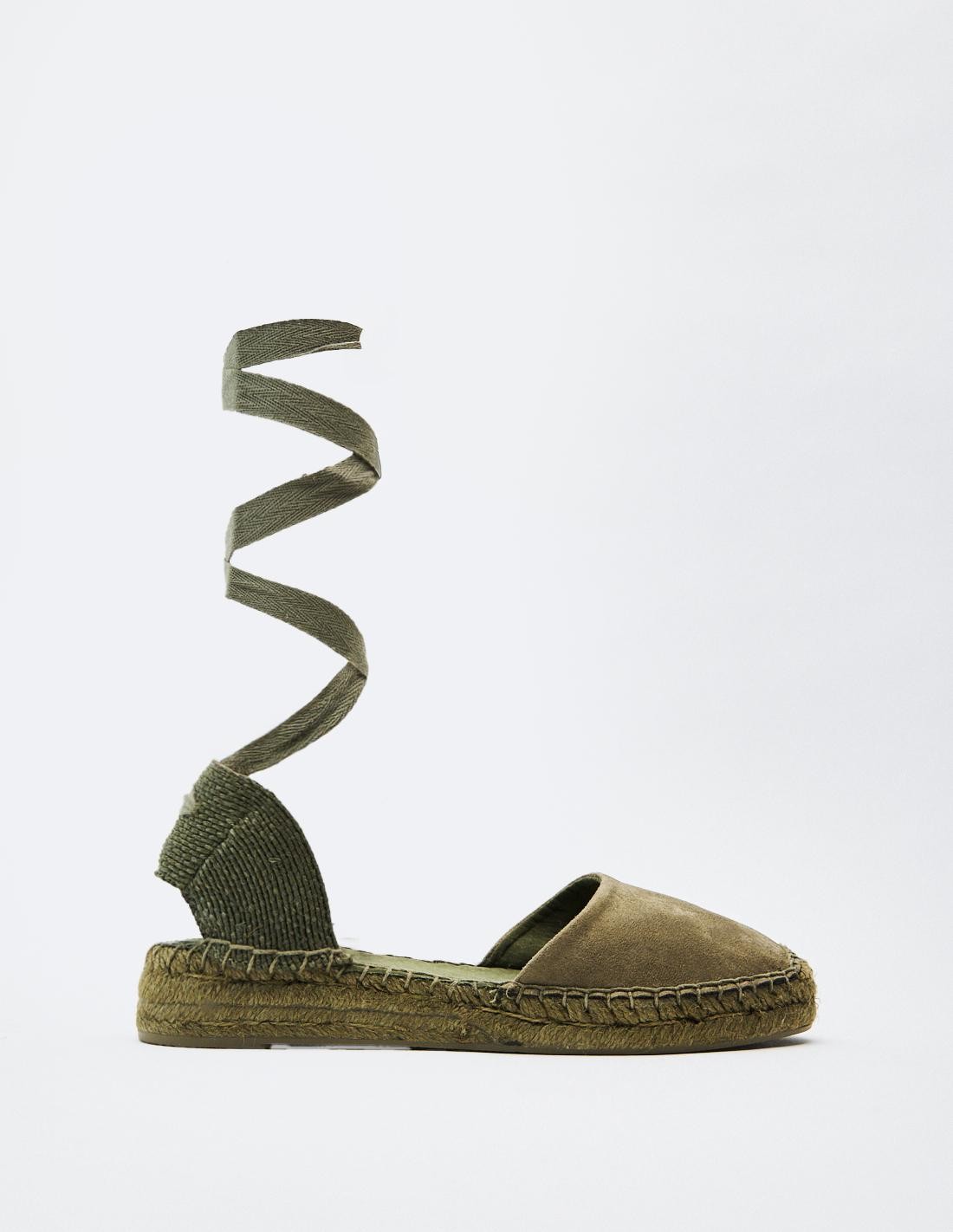 Zapato plano destalonado tipo alpargata. Parte delantera en efecto serraje . Tiras para atar al tobillo. Altura de la suela: 2 cm.