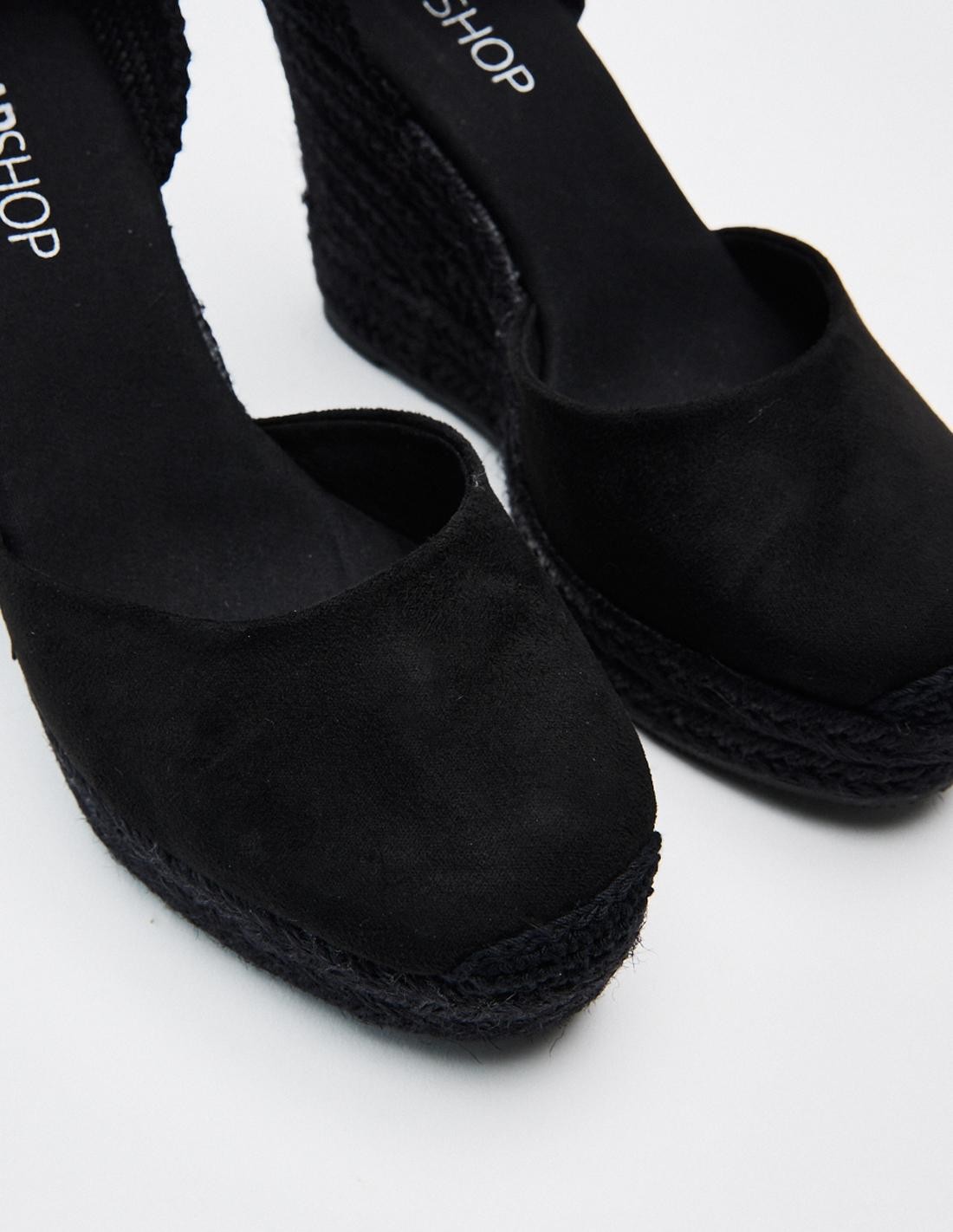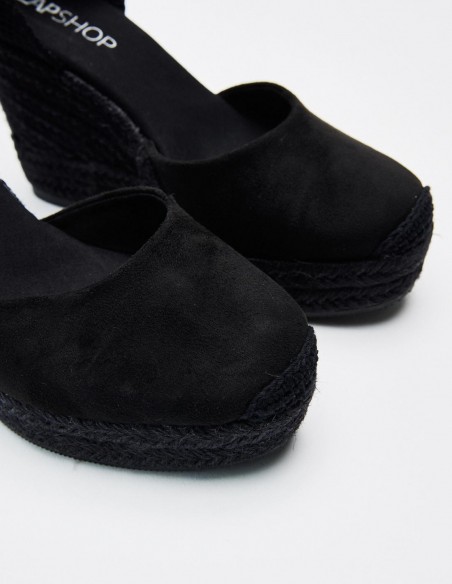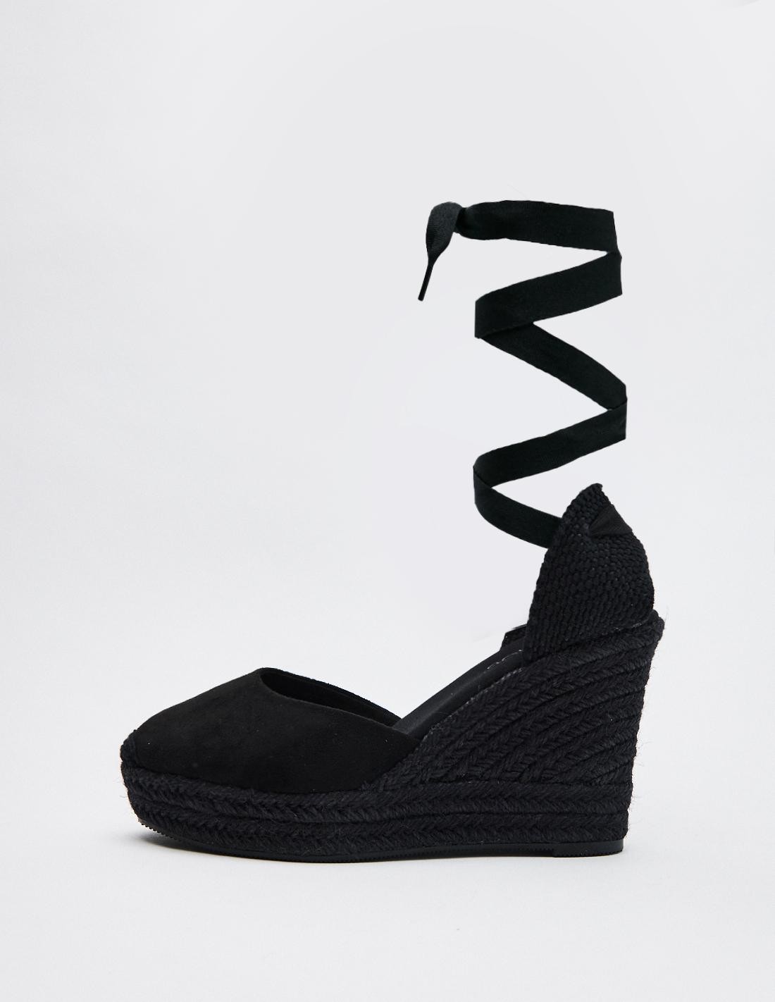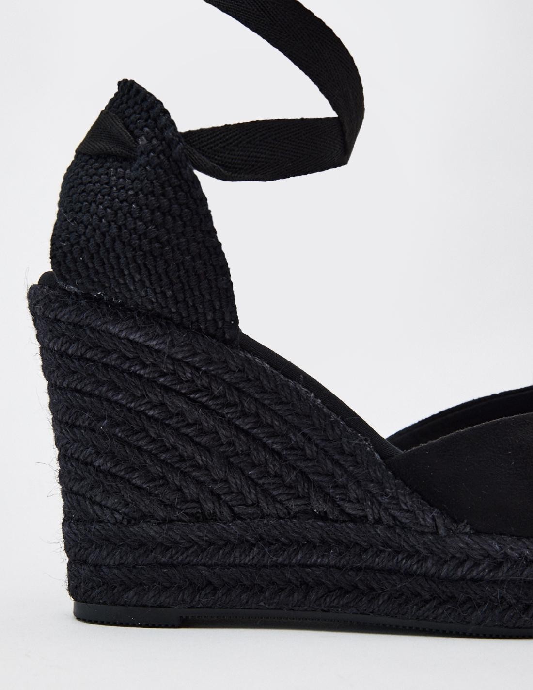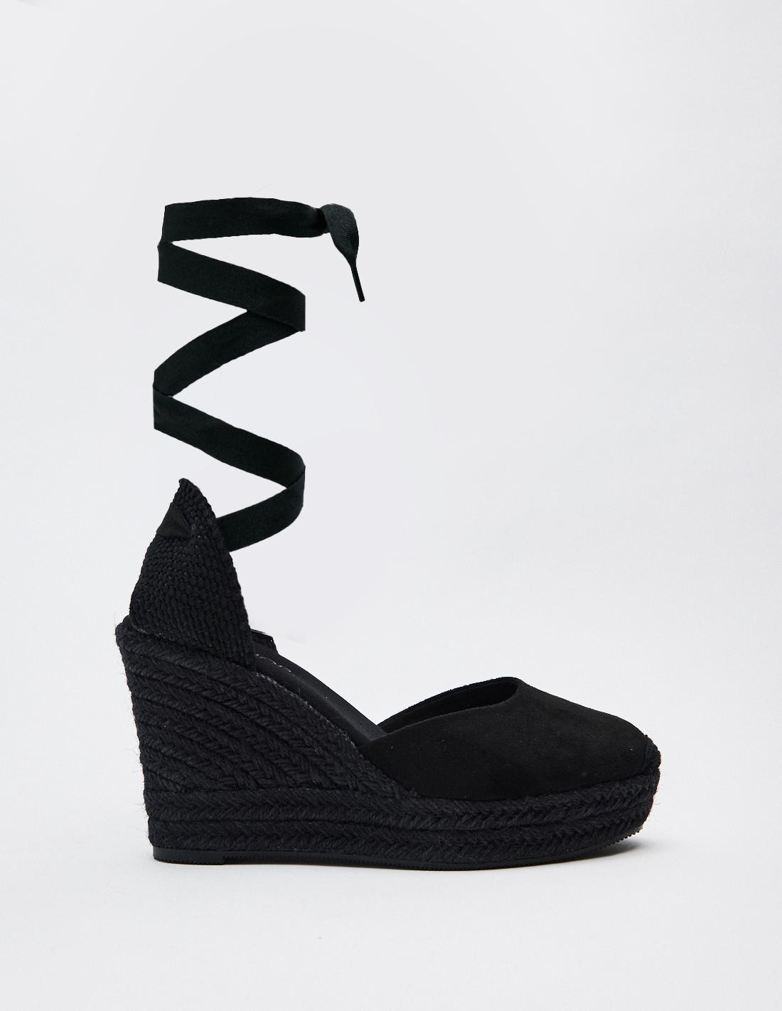 Zapato tipo alpargata con tacón de cuña en efecto yute . Combinación de materiales en el corte. Tiras para atar en el tobillo. Altura del tacón: 12 cm.