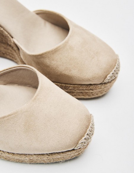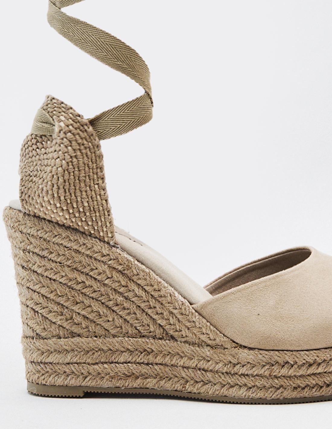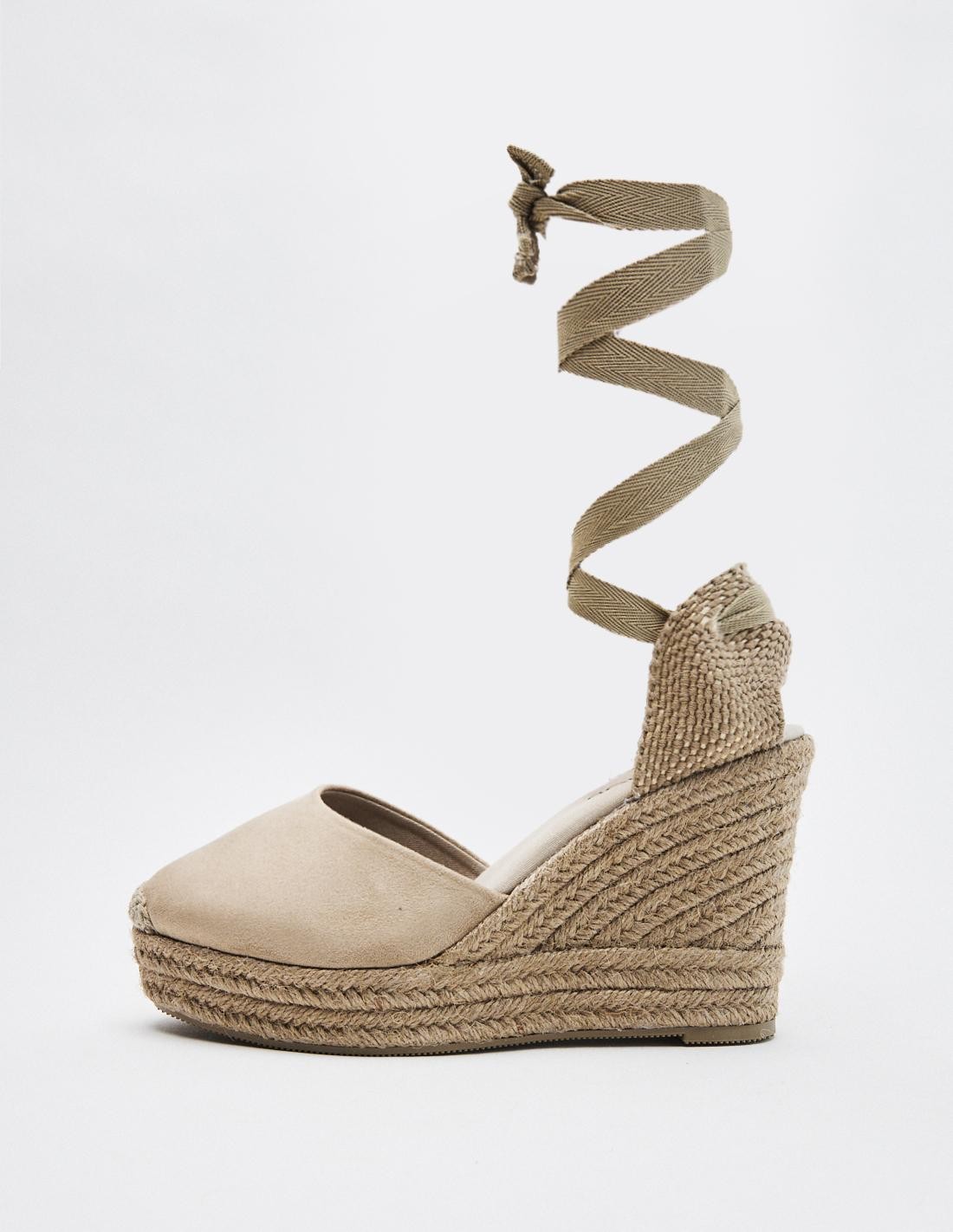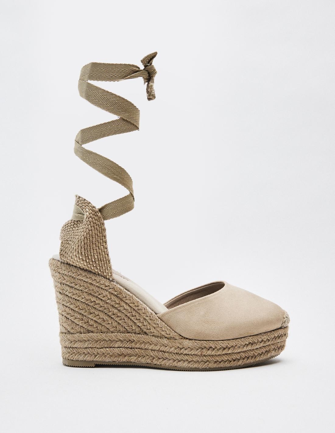 Zapato tipo alpargata con tacón de cuña en efecto yute . Combinación de materiales en el corte. Tiras para atar en el tobillo. Altura del tacón: 12 cm.