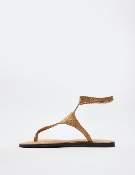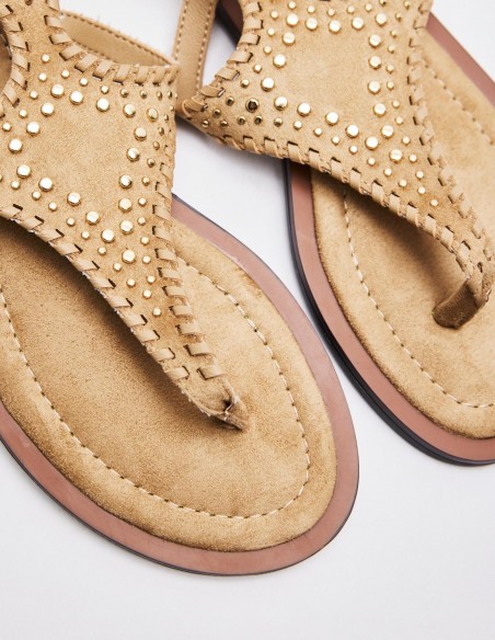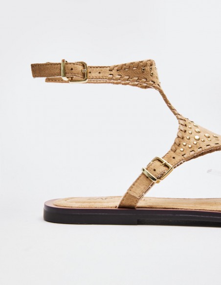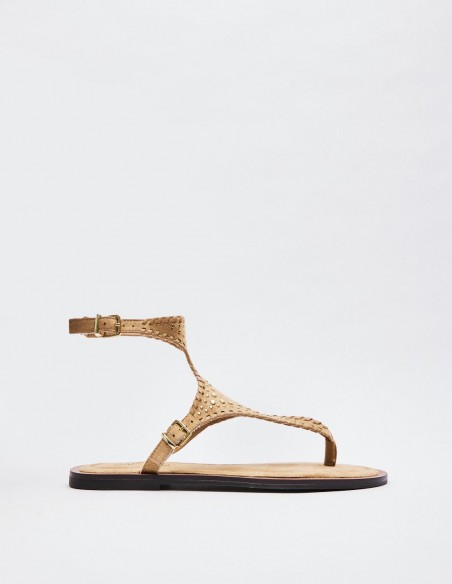 Zapato tipo sandalia plana en efecto serraje. Tira delantera con posición para el dedo. Cierre doble mediante pulsera del tobillo. Acabado en punta redonda. Altura de la suela: 1 cm