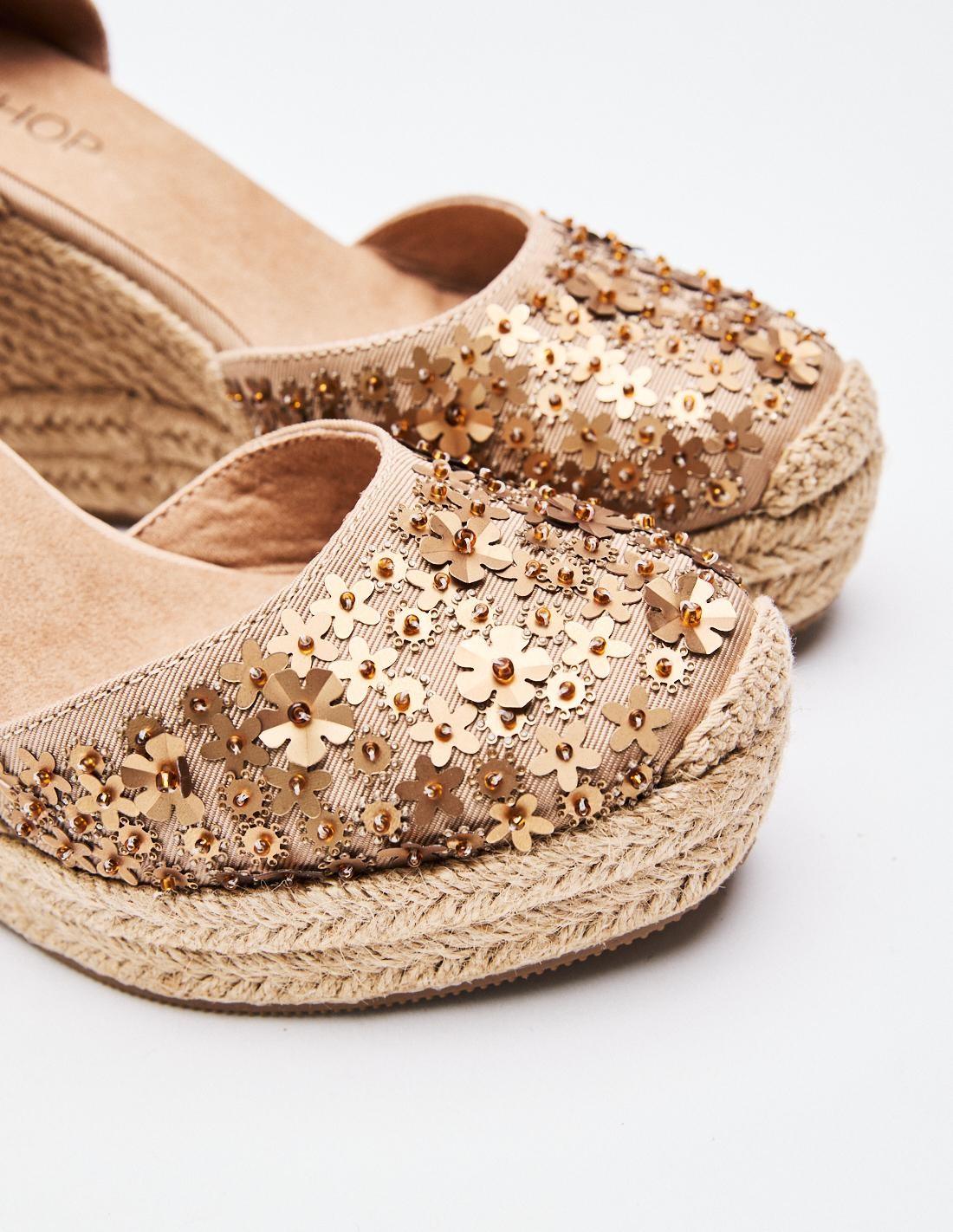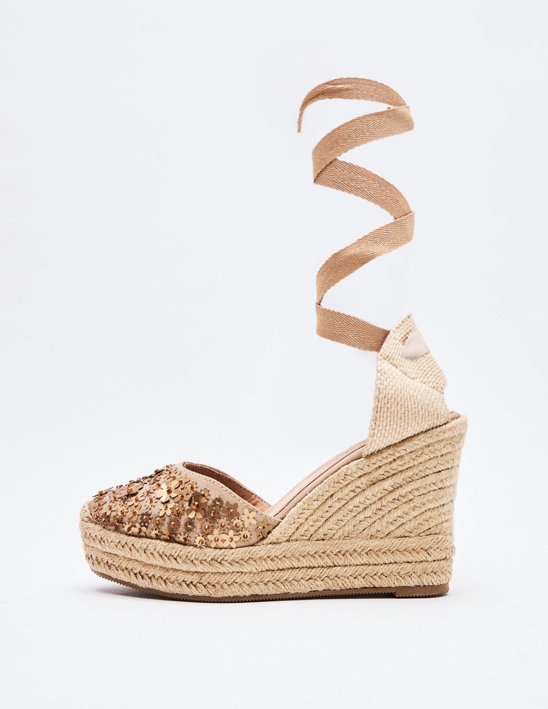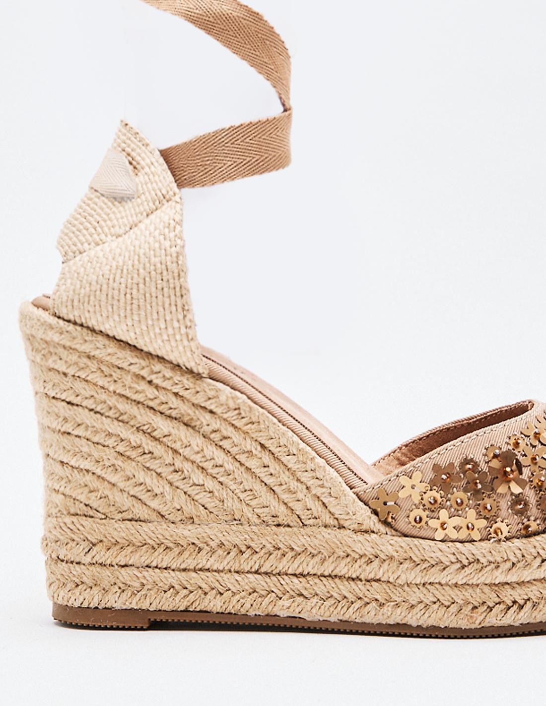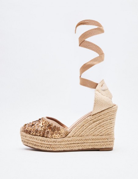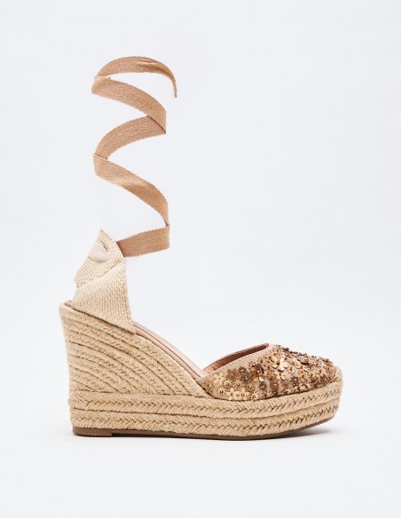 Zapato tipo alpargata estilo cuña en efecto combinado de materialcon destellos brillantes . Suela forrada de yute. Cierre mediante cinta a lo largo de la pierna . Altura tacón : 12 CM