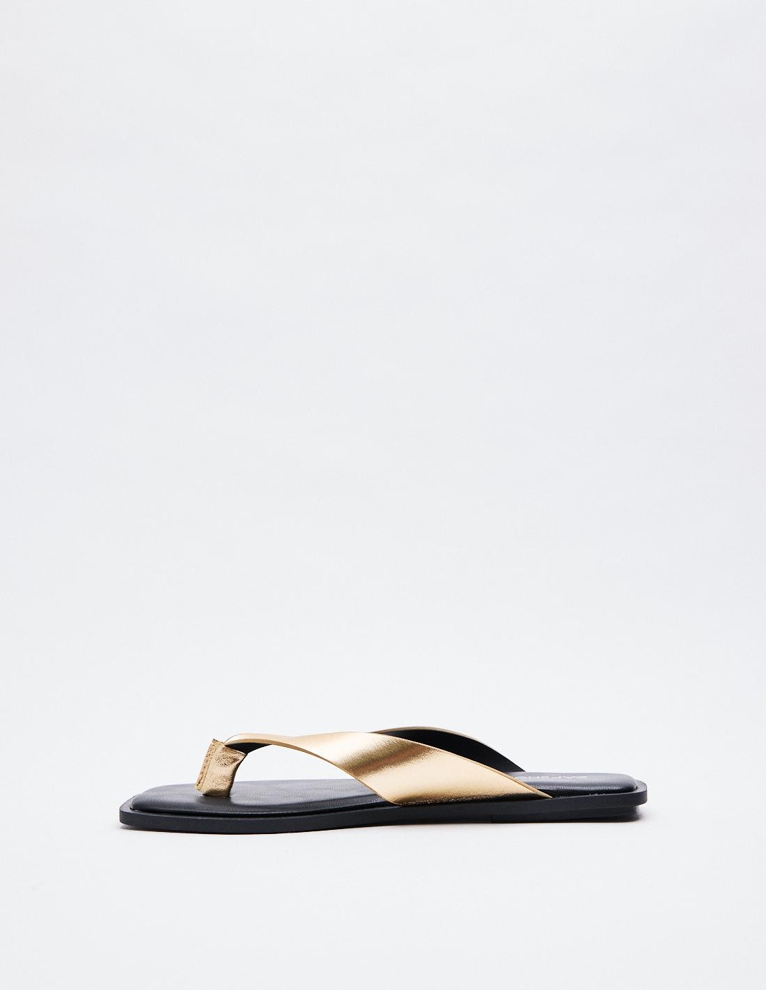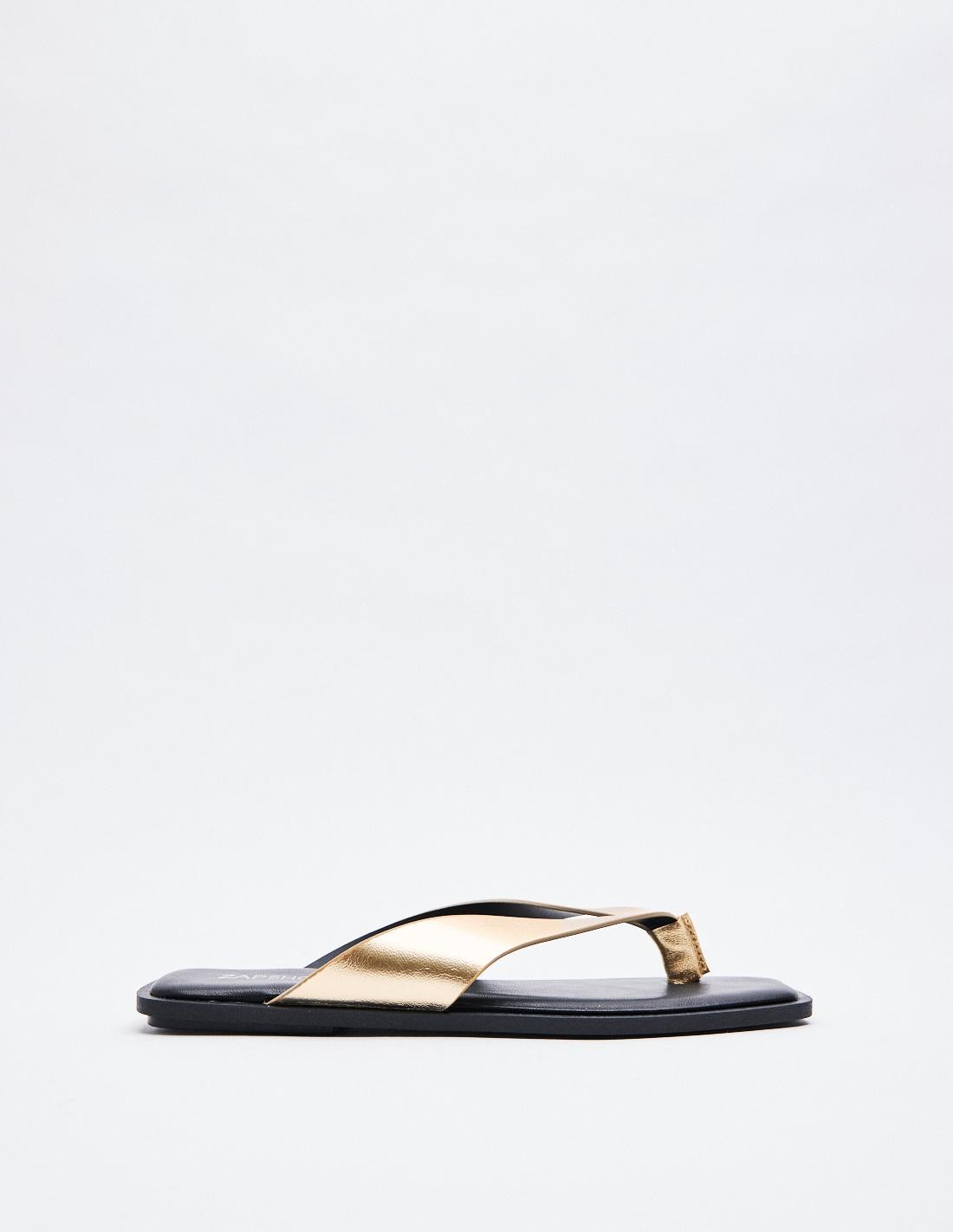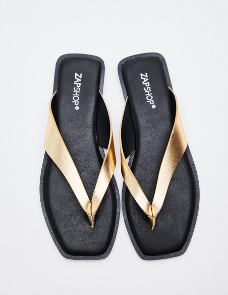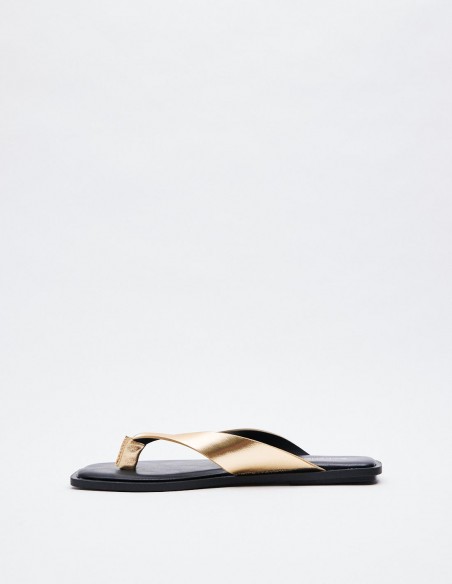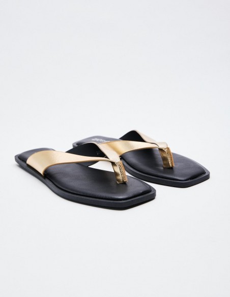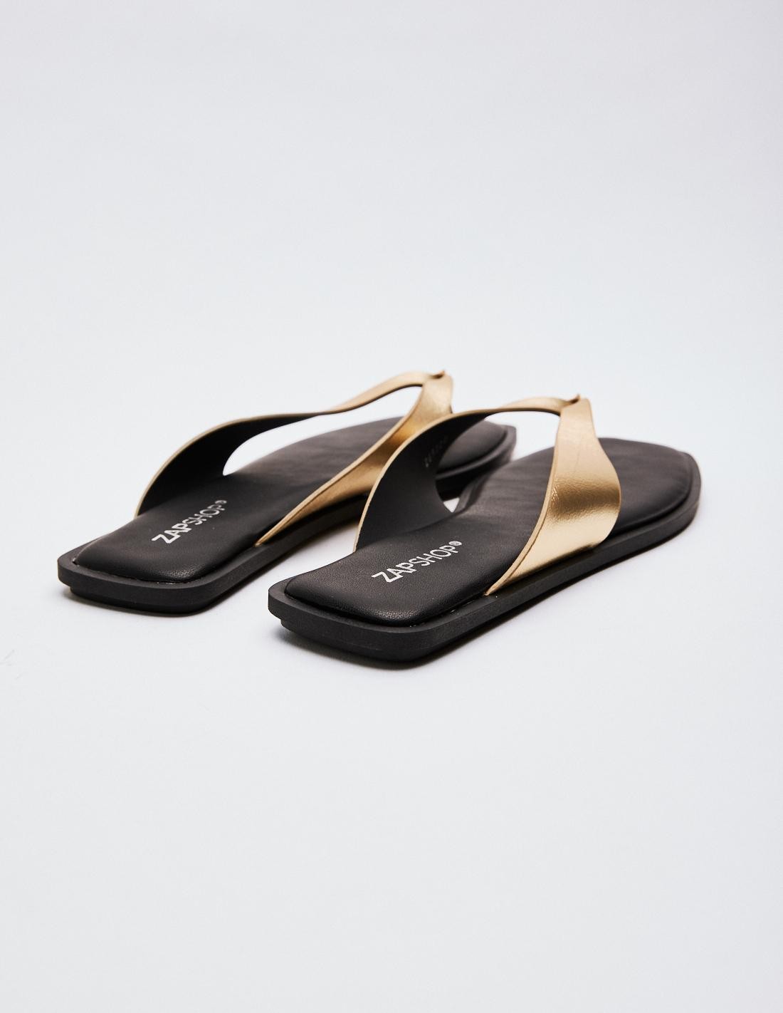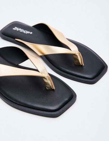 Zapato tipo sandalia plana. Tira con posición para el dedo. Acabado en punta redonda.