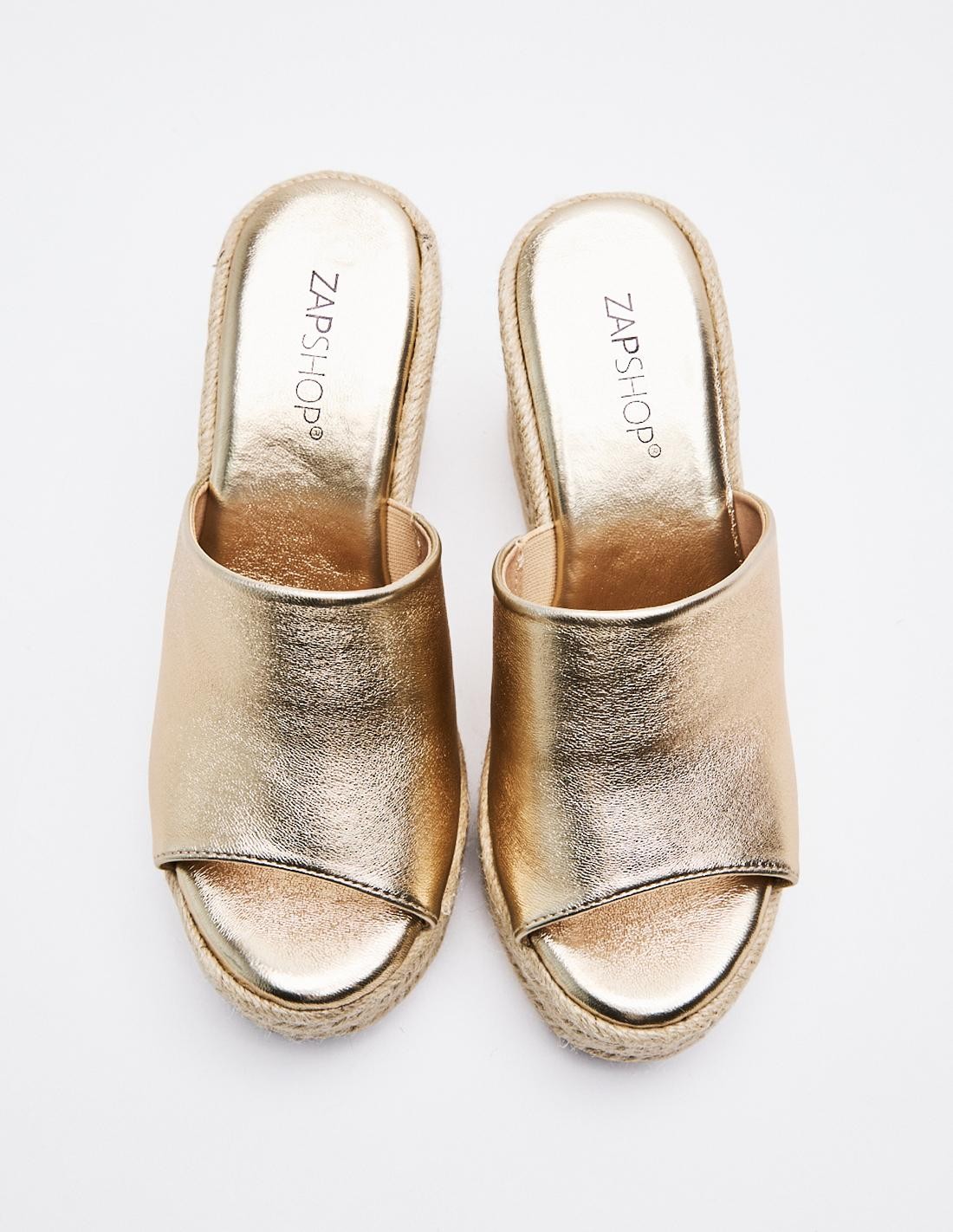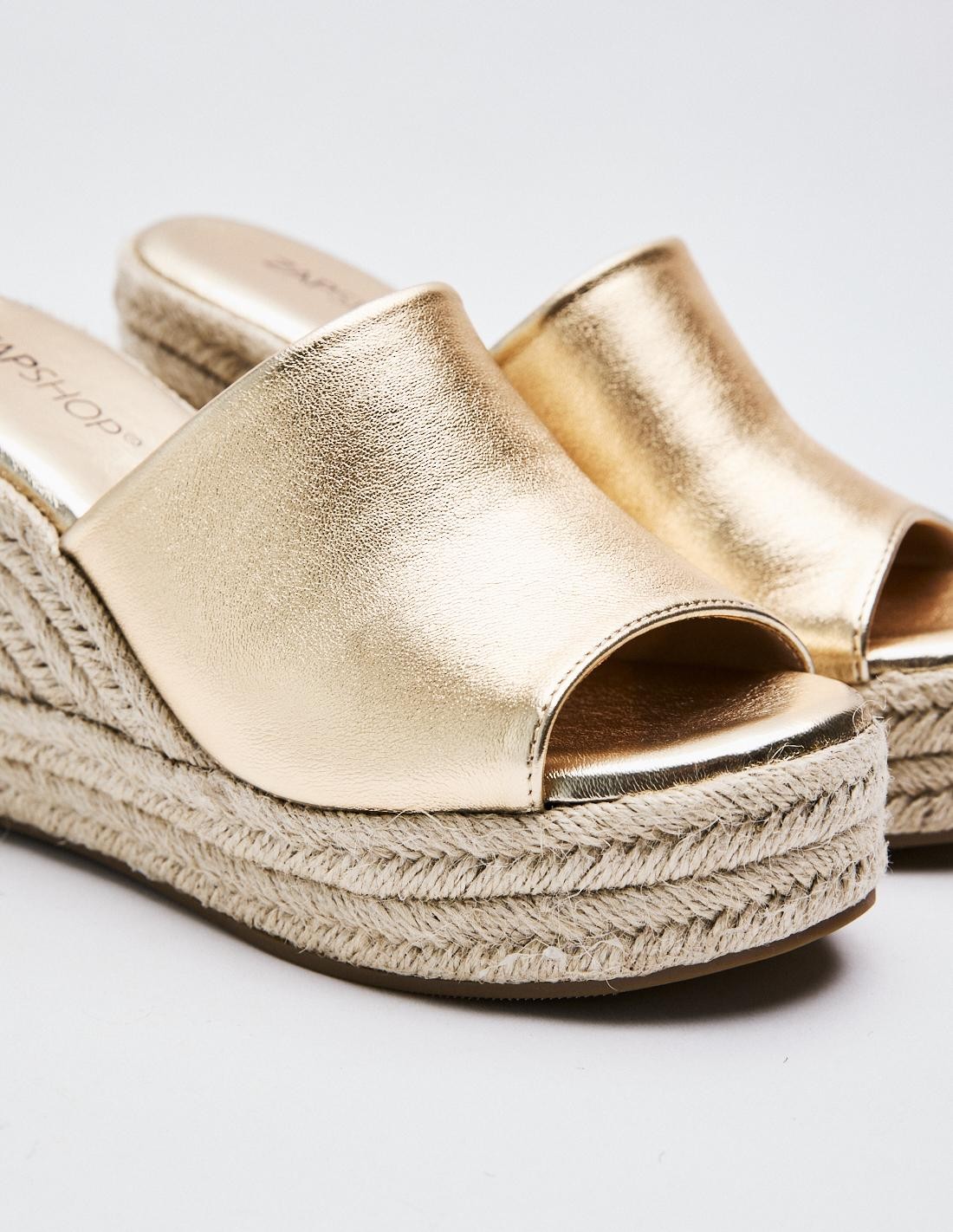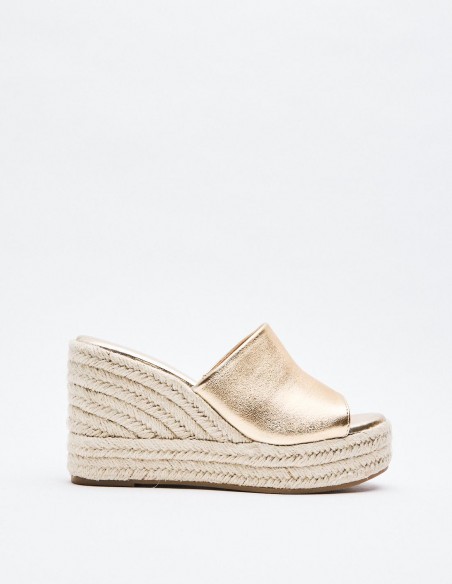 Zapato de tacón tipo cuña con plataforma en efecto piel metalizado . Tira ancha en la parte delantera. Acabado en punta redonda. Altura de la cuña: 12 cm.