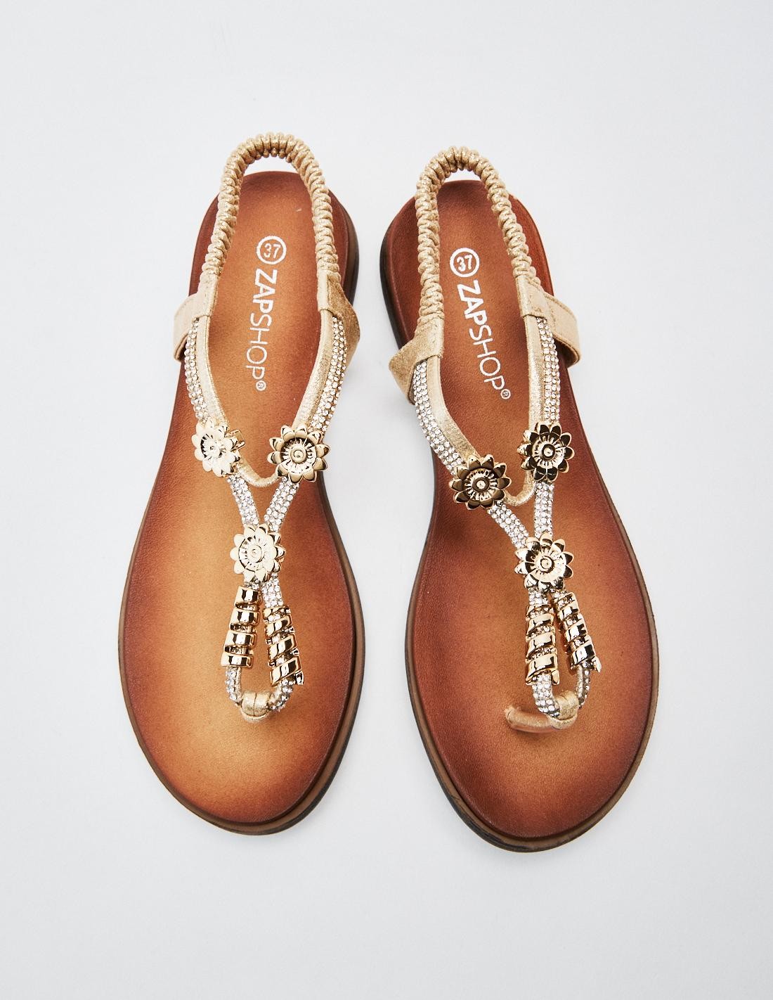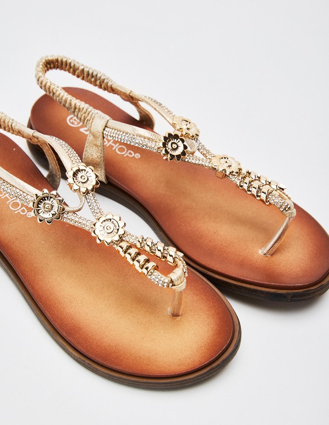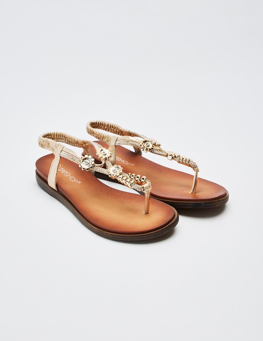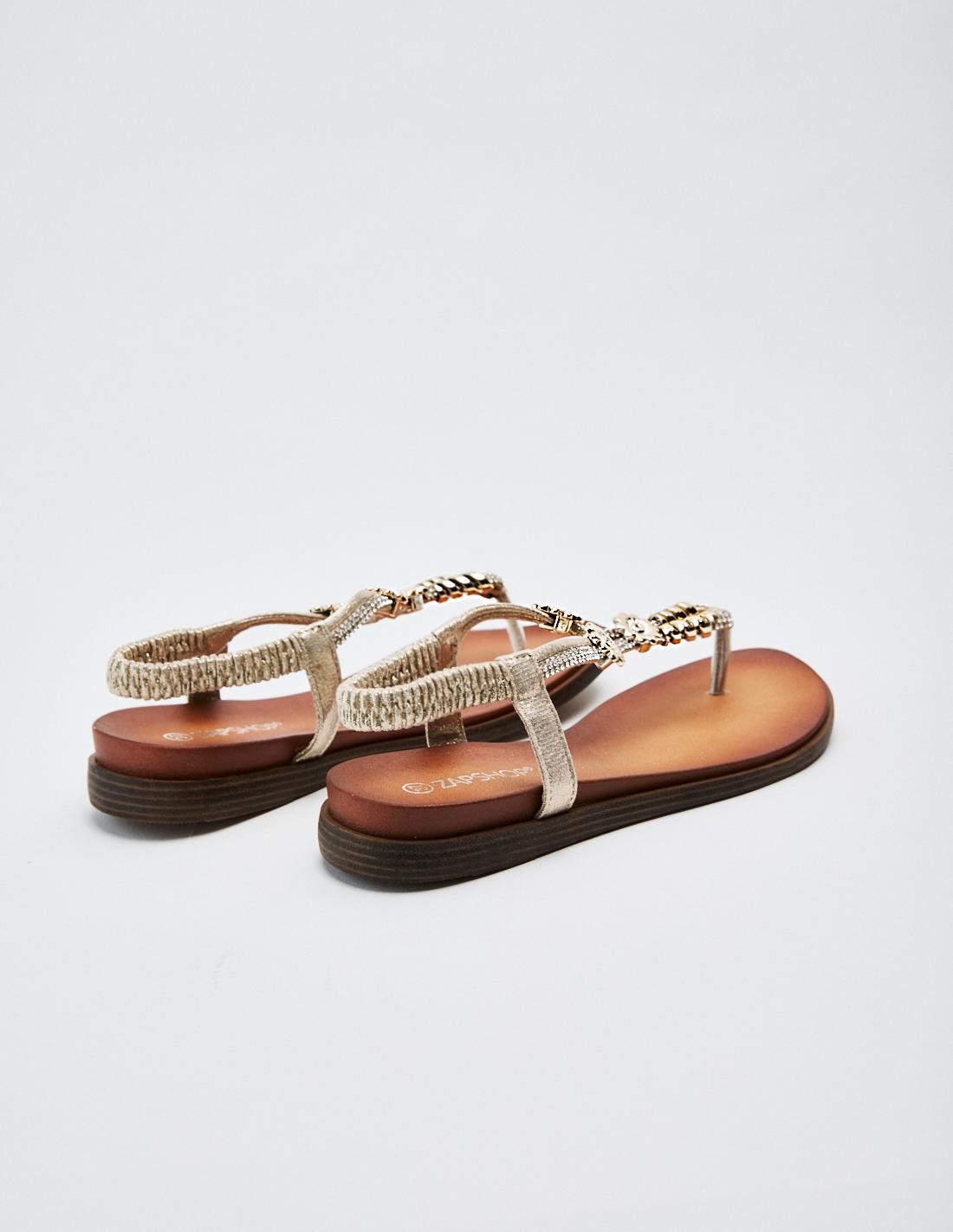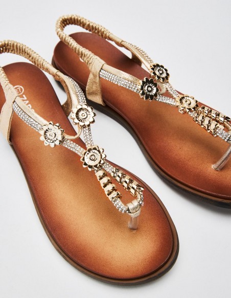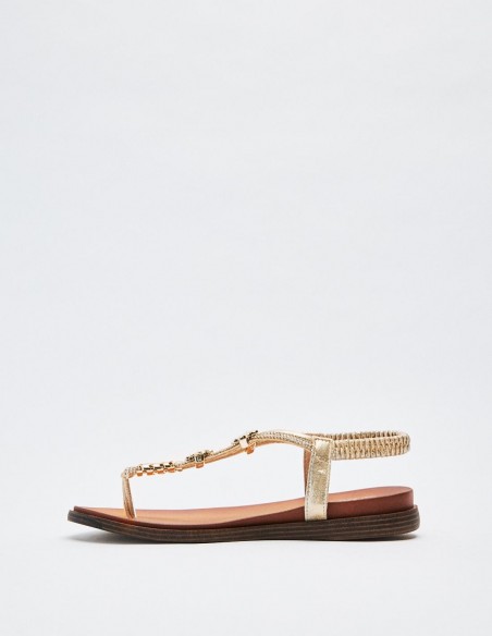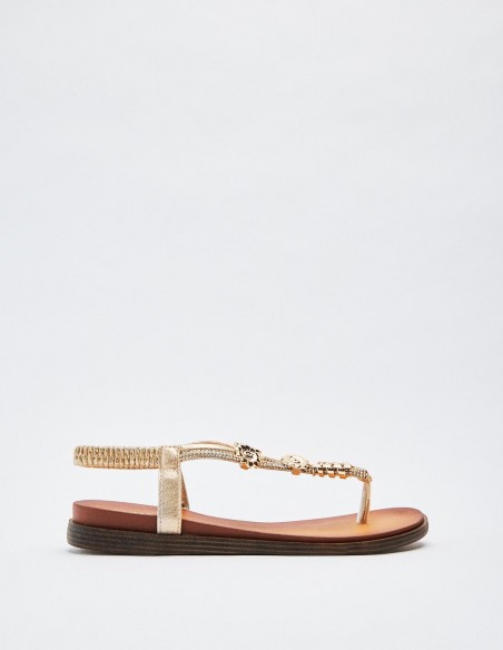 Zapato tipo sandalia plana en efecto metalizado . Detalle en cristales en la parte delantera. Acabado en punta redonda. Cierre mediante pulsera elastica en el tobillo. Altura de la suela: 2 cm.