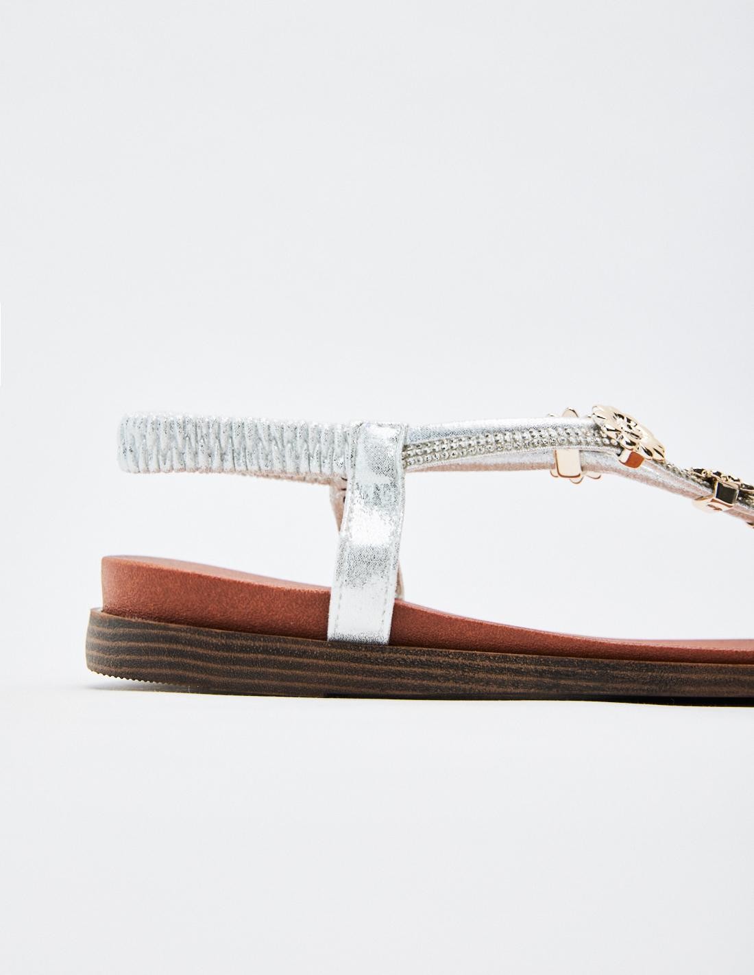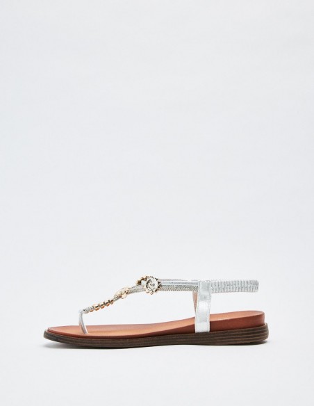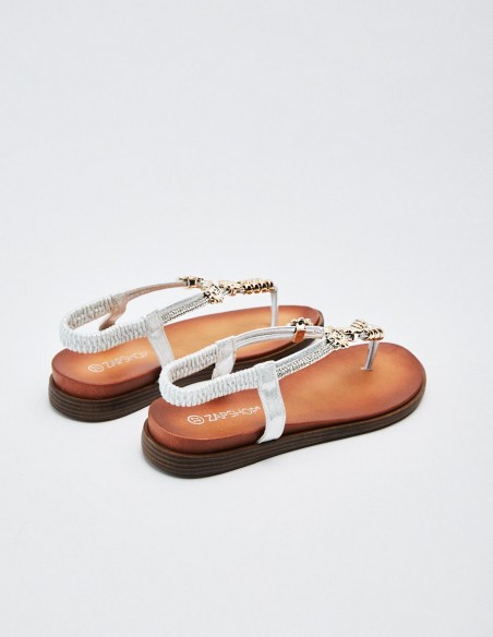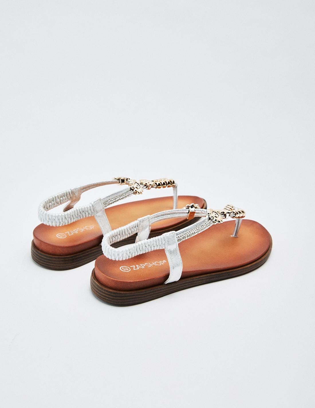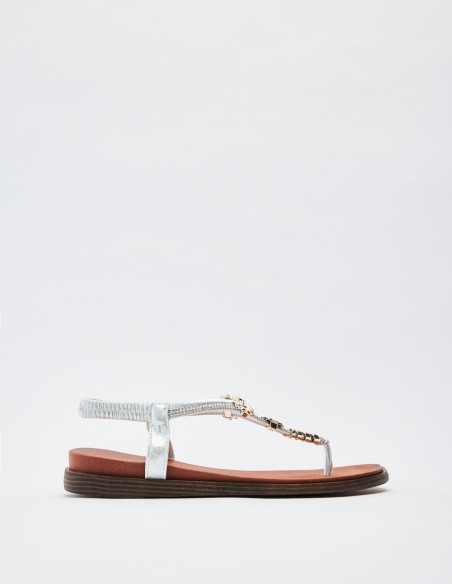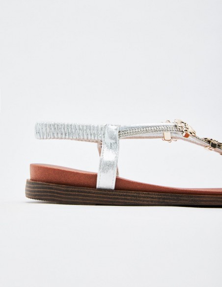 Zapato tipo sandalia plana en efecto metalizado . Detalle en cristales en la parte delantera. Acabado en punta redonda. Cierre mediante pulsera elastica en el tobillo.