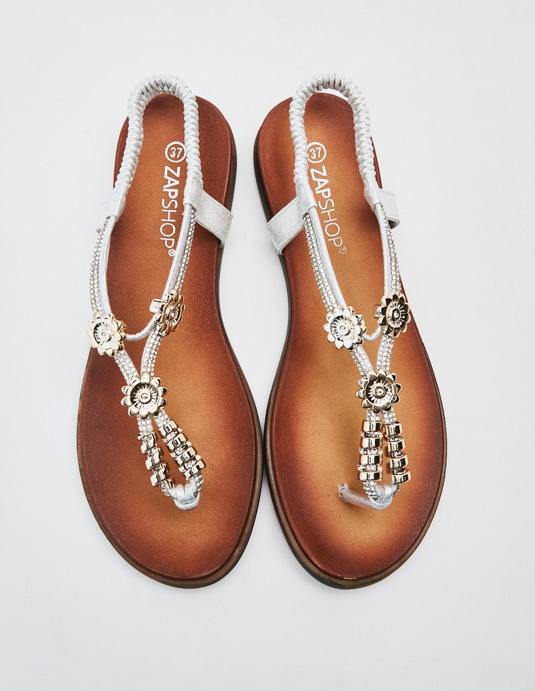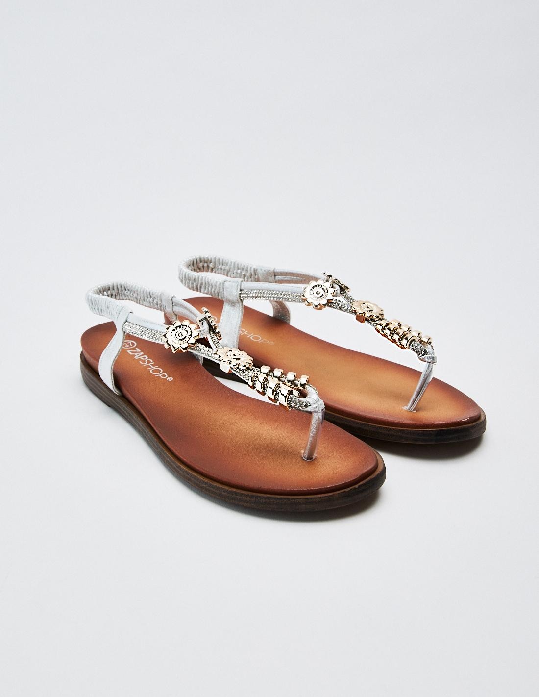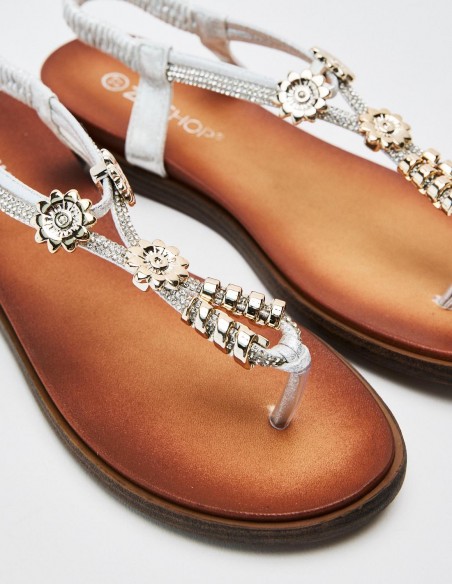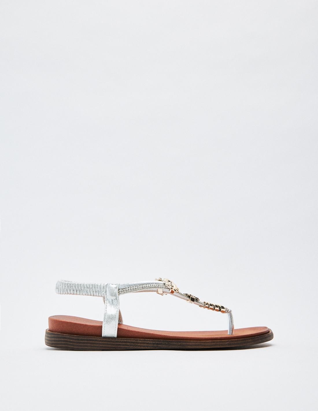 Zapato tipo sandalia plana en efecto metalizado . Detalle en cristales en la parte delantera. Acabado en punta redonda. Cierre mediante pulsera elastica en el tobillo.