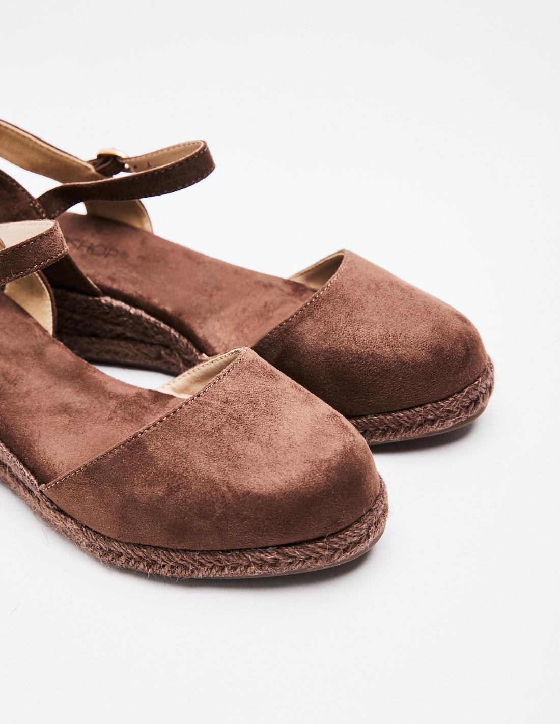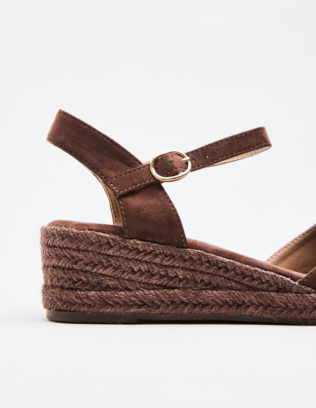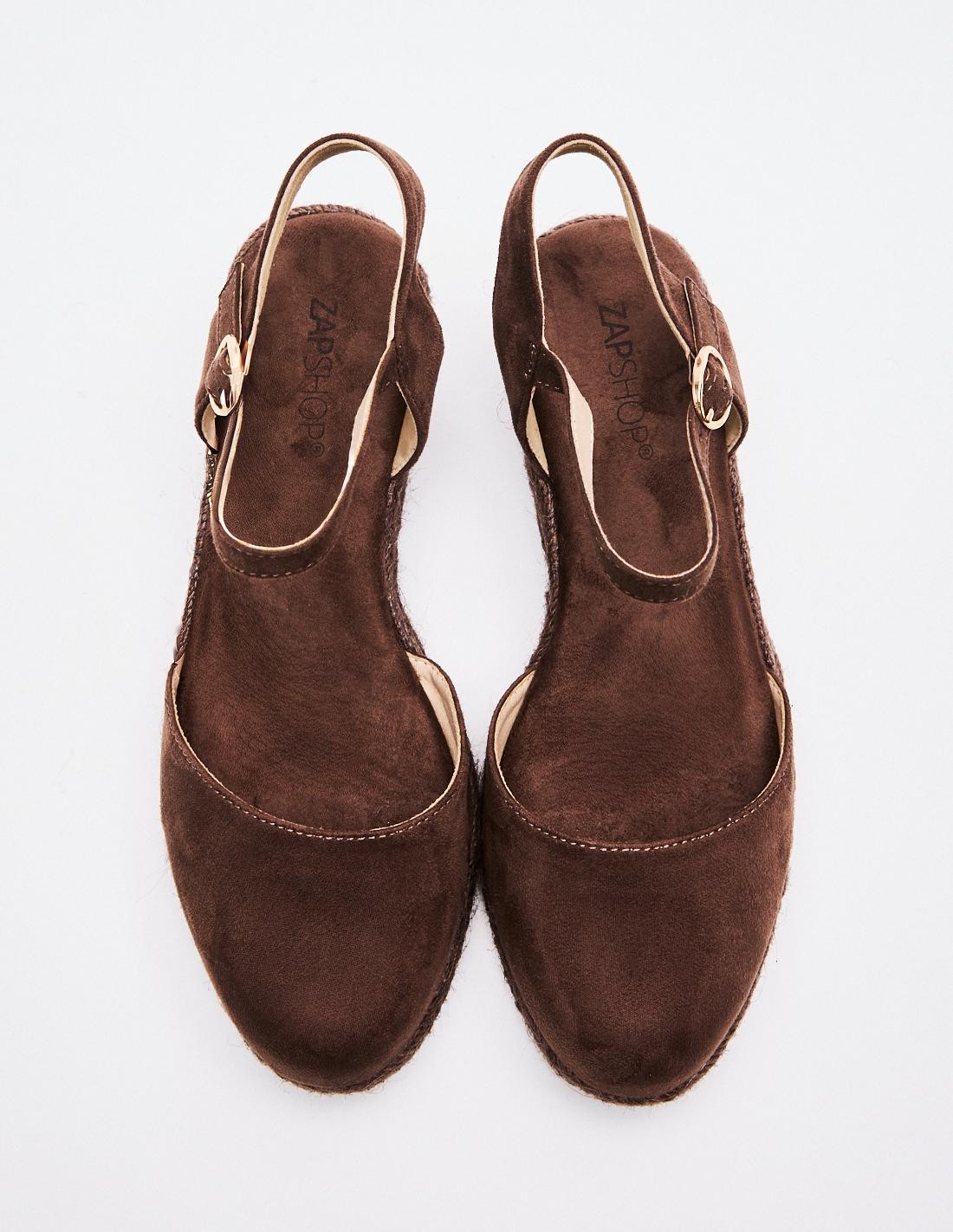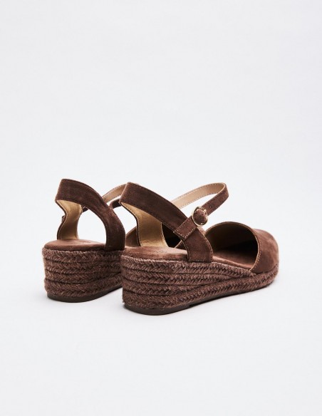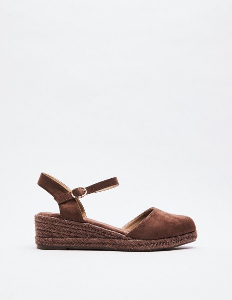 Zapato destalonado con tacón tipo cuña en efecto serraje . Cierre mediante hebilla en la pulsera al tobillo. Altura del tacón: 5 cm.