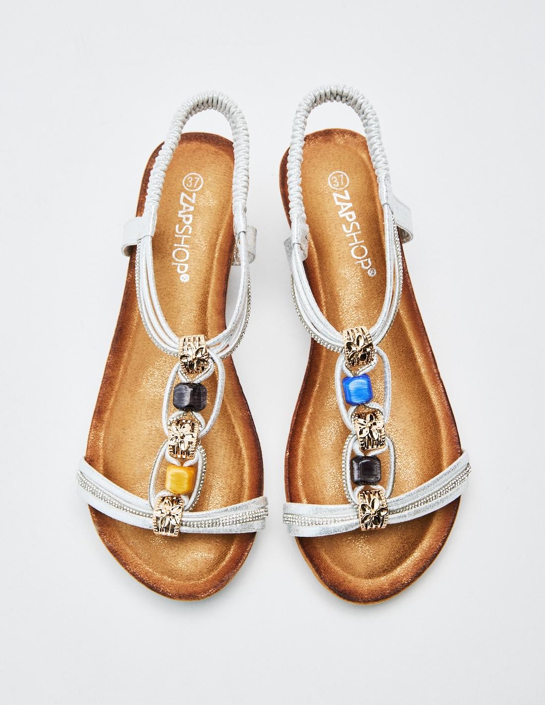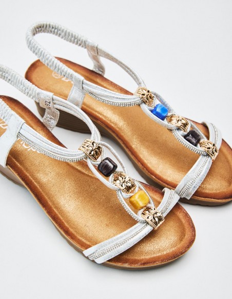 Zapato tipo sandalia en efecto serraje . Tiras anchas en la parte delantera y abalorios en efecto madera . Planta de piel. Suela con volumen. Cierre mediante tira elastica en la parte de atrás del zapato.