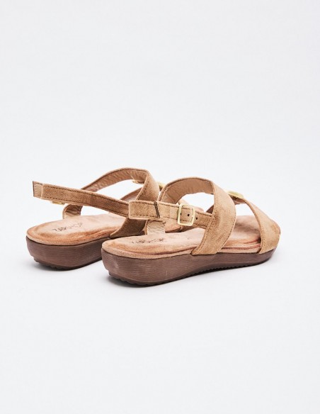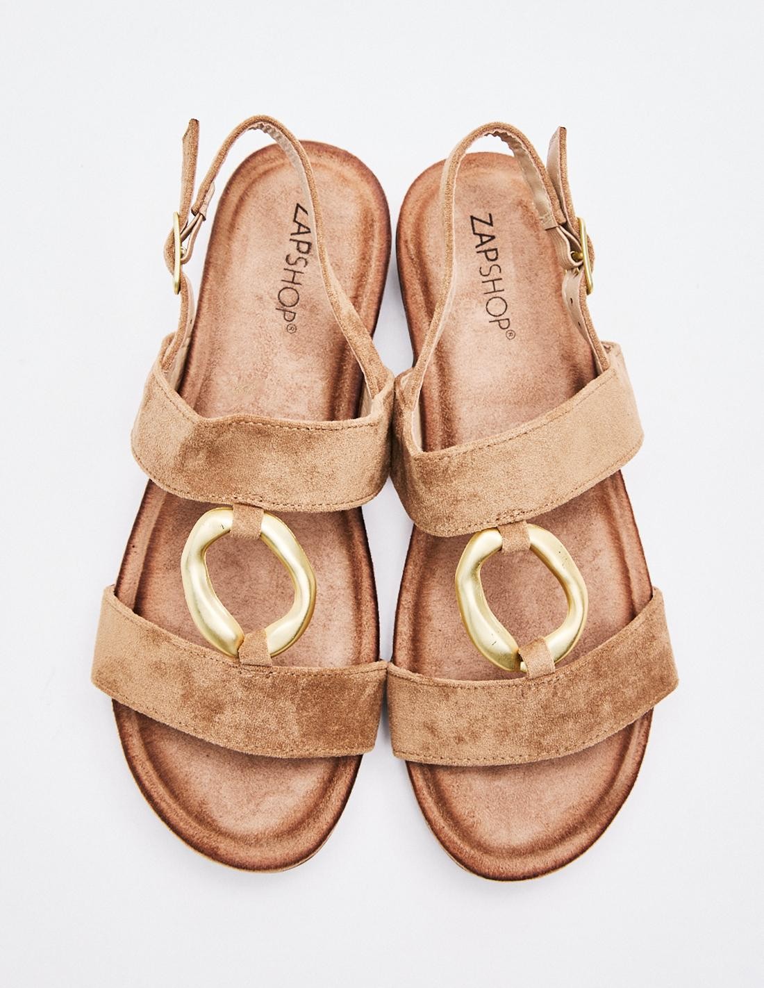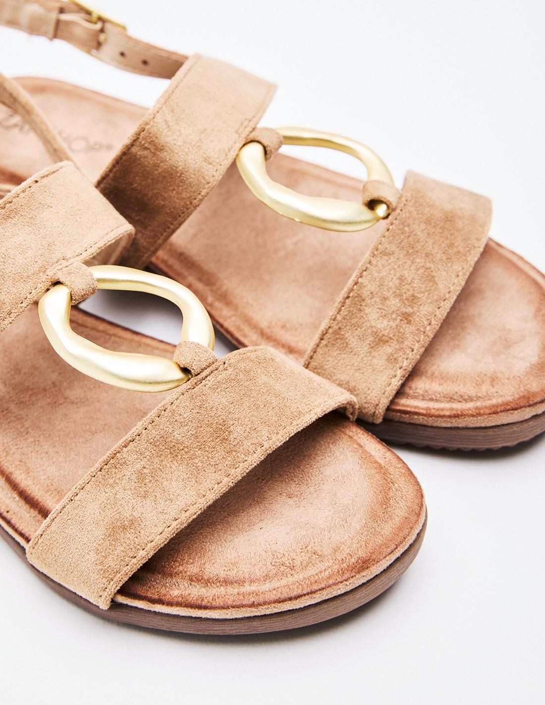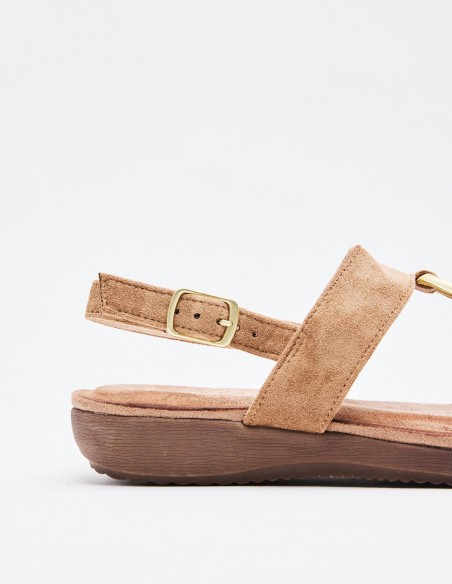 Zapato tipo sandalia en efecto serraje . Tiras anchas en la parte delantera y abalorios en metálico cromado . Planta de piel. Suela con volumen. Cierre mediante pulsera en la parte de atrás del zapato.
